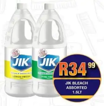 This special is available in various stores, view all products to get the cheapest Jik bleach assorted. If you'd like to find out whether this product has a bigger discount in another store, check the category 'Grocery stores'. You may also find these specials interesting: JIK Bleach Assorted 1.5lt, Jik Liquid Bleach Assorted & JIK Bleach.
