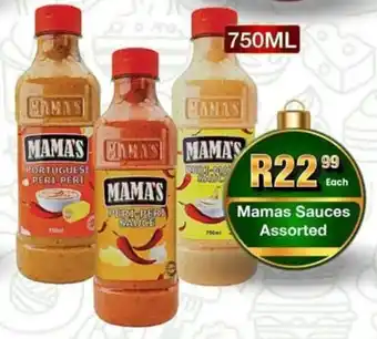 This special is available in various stores, view all products to get the cheapest Mamas Sauces Assorted. If you'd like to find out whether this product has a bigger discount in another store, check the category 'Grocery stores'. You may also find these specials interesting: Nando's Sauces Assorted, Nando's Sauces Assorted & Mama's Sauces Assorted.
