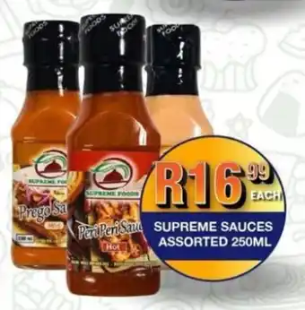 This special is available in various stores, view all products to get the cheapest Supreme sauces assorted. If you'd like to find out whether this product has a bigger discount in another store, check the category 'Grocery stores'. You may also find these specials interesting: Supreme sauces asst, STEERS Sauces Assorted & Steers sauces.