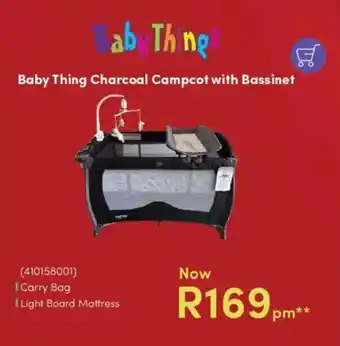 This special is available in various stores, view all products to get the cheapest Baby Thing Charcoal Campcot with Bassinet. If you'd like to find out whether this product has a bigger discount in another store, check the category 'Electronics'. You may also find these specials interesting: Baby Things Grey Campcot, Bush Baby Charcoal Pro Kettle Braai & Safeway Pacifiy Grey Campcot.