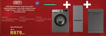 Defy Manhattan Grey Front Loader Washing Machine+ Defy Metallic Combi Fridge/Freezer+ Defy 13 Place Manhattan Grey Dishwasher promotion at Teljoy