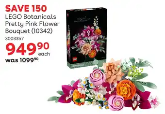 The price of LEGO Botanicals Pretty Pink Flower Bouquet can be found at the top of the page, together with the dates during which the special is available. You can also check the price in the current ToysRUs catalogue or on the ToysRUs website. Promotional offers assure you of buying ToysRUs products at the lowest price.