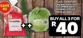 CLASS 1 TOMATOES 1kg bag + ENGLISH CUCUMBER each + ICEBERG LETTUCE HEAD per pack