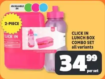 This special is available in various stores, view all products to get the cheapest Click in lunch box combo set. If you'd like to find out whether this product has a bigger discount in another store, check the category 'Grocery stores'. You may also find these specials interesting: CLICK-IN LUNCH BOX WITH BOTTLE SET, LUNCH BOX & BOTTLE SET & LUNCH BOX.