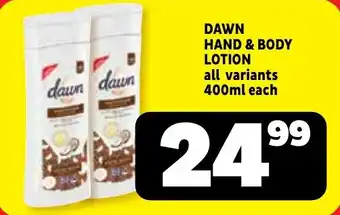 Usave offers a wide collection of products, besides the Dawn hand & body lotion. Keep an eye on the weekly Usave catalogue to find the best specials and promotions. Besides Dawn hand & body lotion, you can also find the following offers: DAWN Hand & body Lotion 400ml/300ml Tub Assorted, Dawn Body Lotion & Dawn Body Lotion.