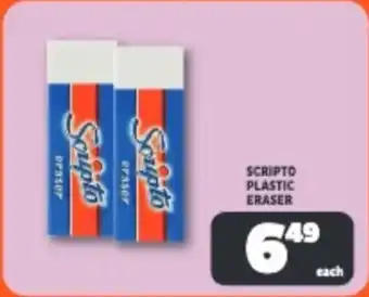 This special is available in various stores, view all products to get the cheapest Scripto plastic eraser. If you'd like to find out whether this product has a bigger discount in another store, check the category 'Grocery stores'. You may also find these specials interesting: Plastic Sharpener With Eraser, Scripto Canister Sharpener & Eraser-1s & Edu-Max Plastic Eraser.