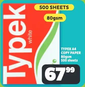 This Typek A4 copy paper is currently available as part of a special promotion at Usave. Be sure to check the current promotions filled with competitive prices and deals. You can order Typek A4 copy paper online via Usave website or get it at the best available price. Cataloguespecials.co.za collects the most relevant Typek A4 copy paper offers and specials for you. Want to be notified first? Click the bell icon to receive a free alert when the product is part of a new promotion or available again.