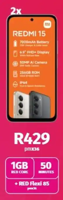 The price of Redmi 15 can be found at the top of the page, together with the dates during which the special is available. You can also check the price in the current Vodacom catalogue or on the Vodacom website. Promotional offers assure you of buying Vodacom products at the lowest price.