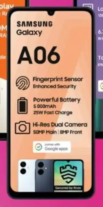 This special is available in various stores, view all products to get the cheapest Samsung Galaxy A06. If you'd like to find out whether this product has a bigger discount in another store, check the category 'Electronics'. You may also find these specials interesting: Samsung Galaxy A36 5G, Samsung Galaxy A56 5G & Samsung Galaxy A07.