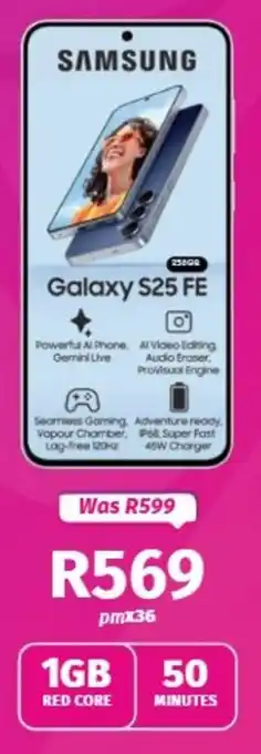 This Samsung Galaxy S25 FE is currently available as part of a special promotion at Vodacom. Be sure to check the current promotions filled with competitive prices and deals. You can order Samsung Galaxy S25 FE online via Vodacom website or get it at the best available price. Cataloguespecials.co.za collects the most relevant Samsung Galaxy S25 FE offers and specials for you. Want to be notified first? Click the bell icon to receive a free alert when the product is part of a new promotion or available again.